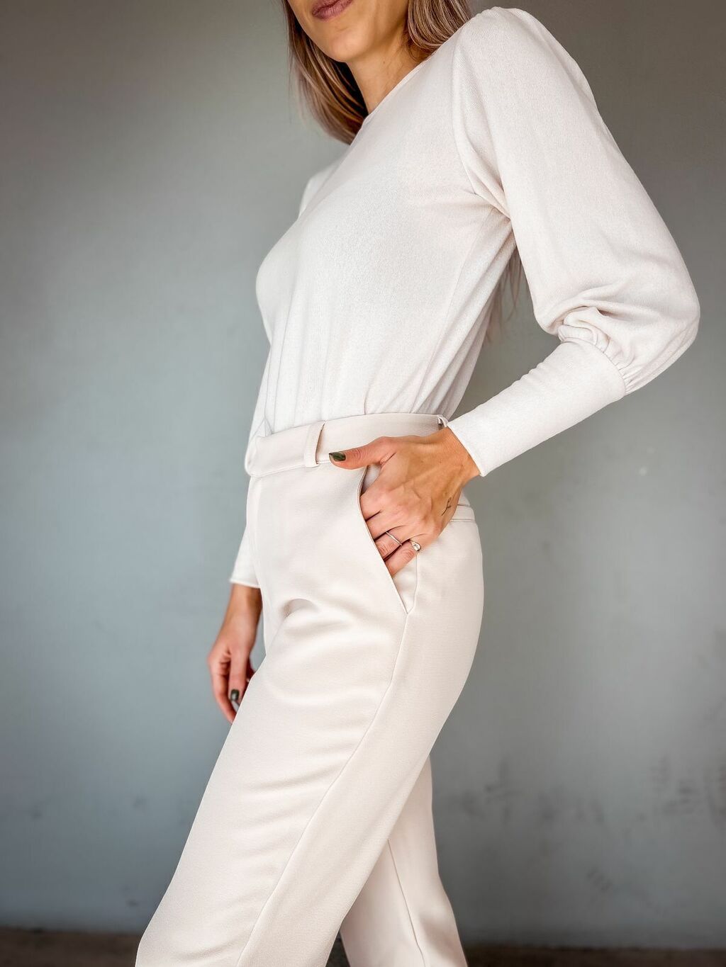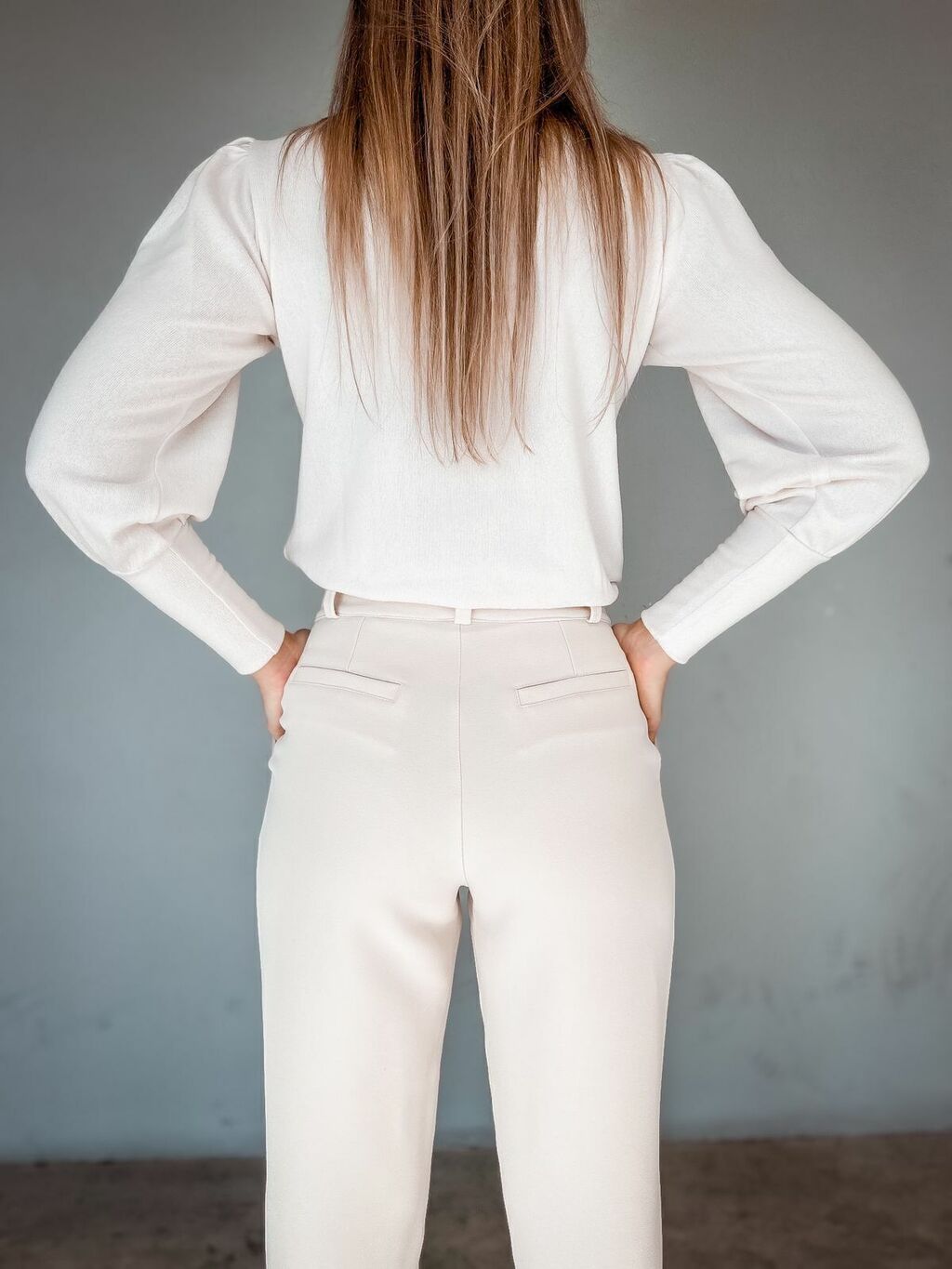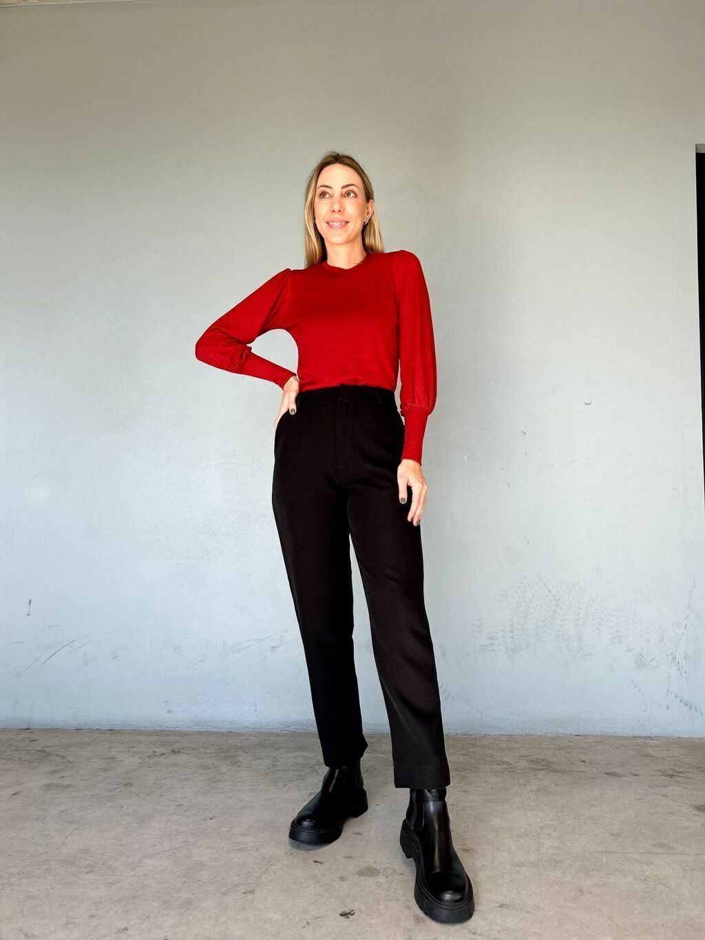 Calça alfaiataria com pence nas costas e com passador para cinto. Tecido mais grosso.