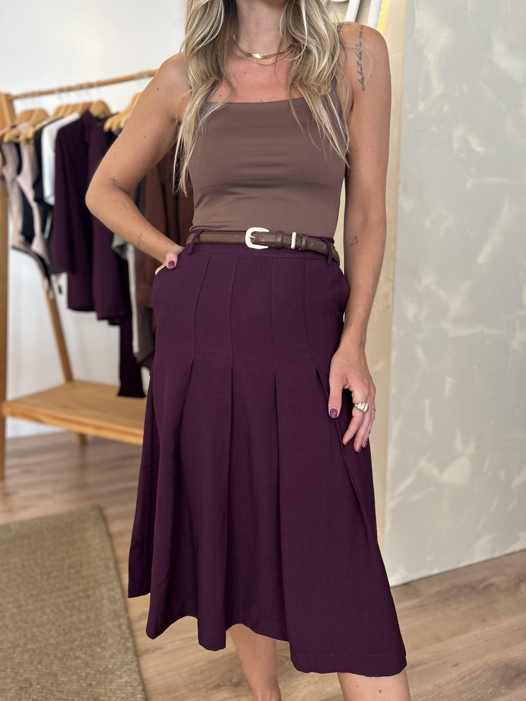 Saia mídi com pregas e bolsos.